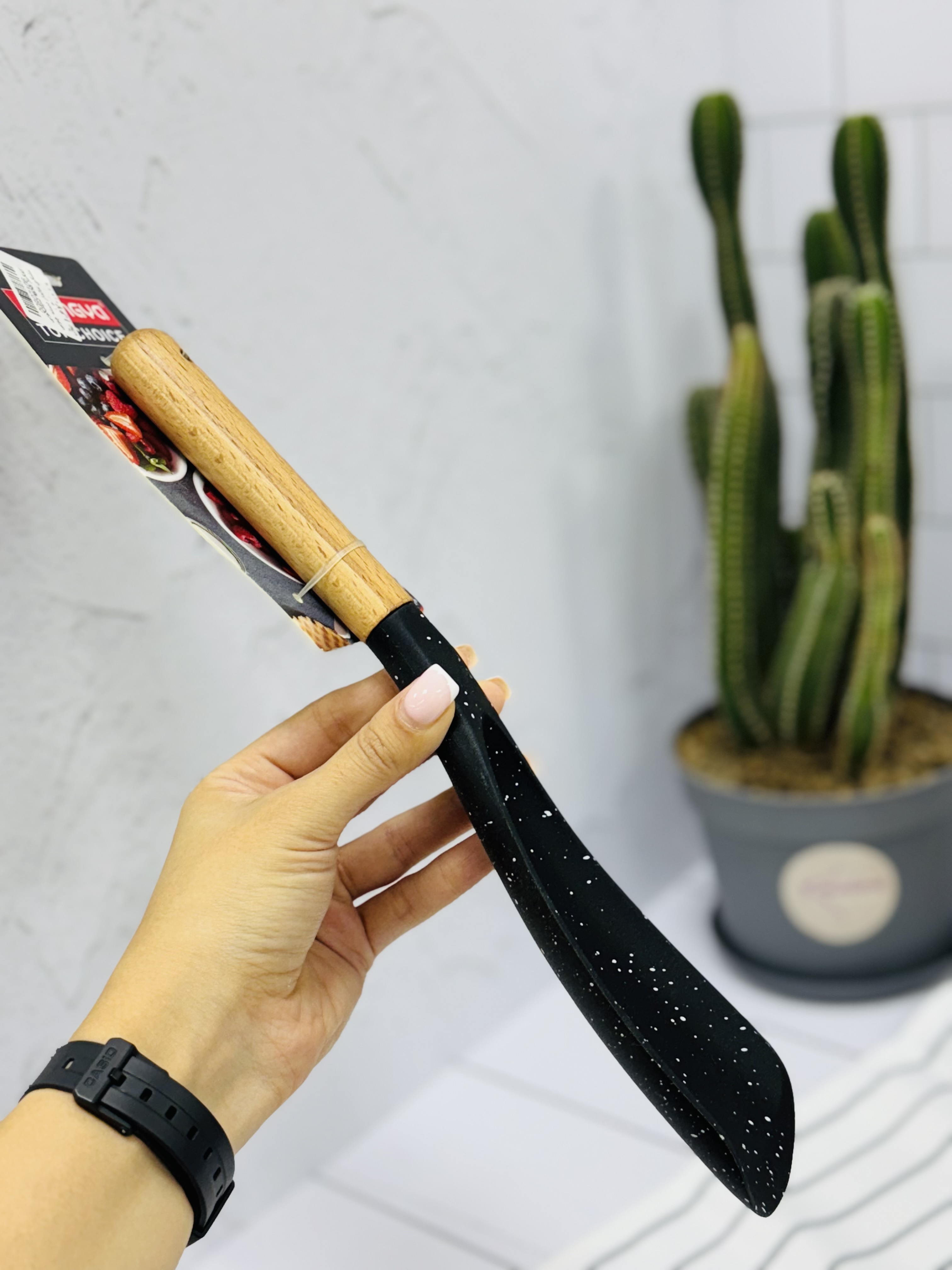 گفگیر ملاقه سیلیکونی مشکی خالدار دسته چوبی